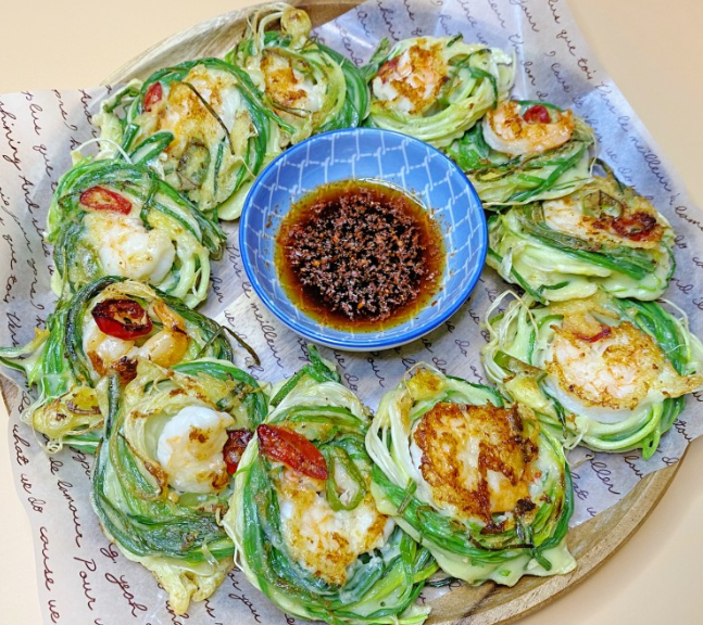 4️⃣ 팬에 기름을 두르고 달래 반죽을 노릇하게 부친다.